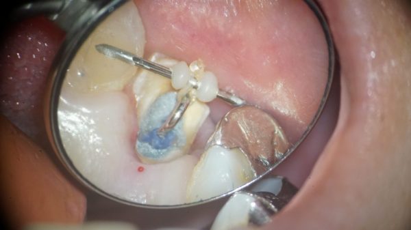大きな虫歯はないように見られますが、再度古い詰め物はつけられそうにないので、まずは古いセメントを取り除いて内部の状態を確認することになりました。