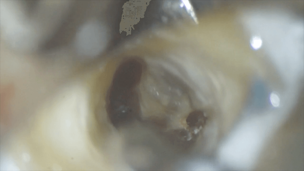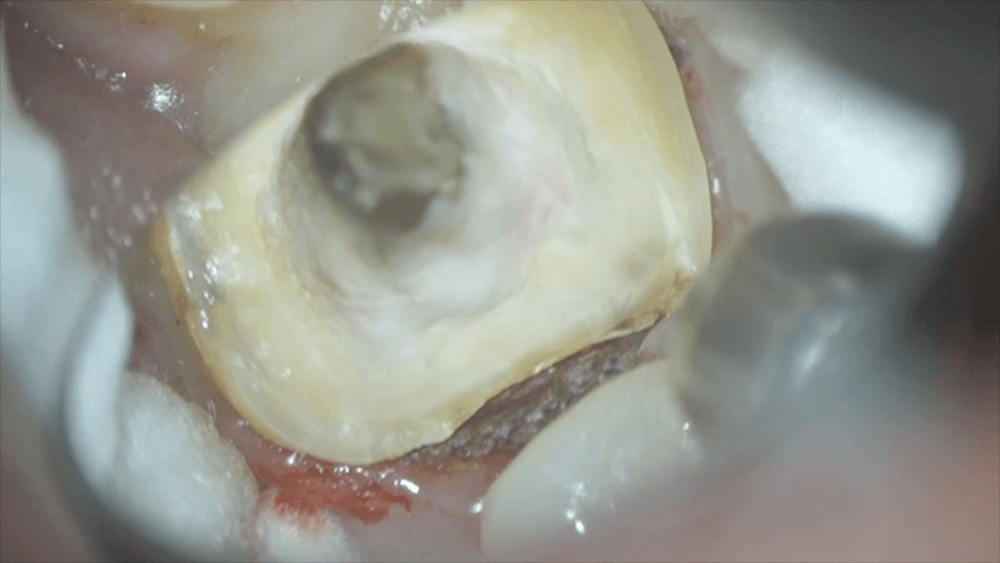 この出血を、内部をきれいにすることにより止め、内部をドリルで探索すると、
