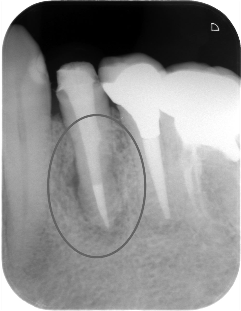 ⭕️で囲みました。このような場合は、基本的に抜歯なります。歯茎の腫れの原因は、根の表面に入ったヒビに入り込んだ汚れであり、その汚れを、抜歯という外科的処置にて取り除く、ということになります。
