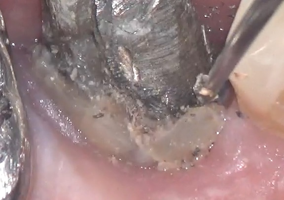 マイクロスコープで確認しながら、歯を触ると、内部からは、ゴミのようなカスが、ボソボソと出てきました。