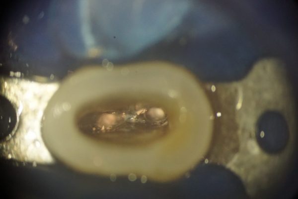 これは歯にラバーダム防湿を行い、歯を上から見た写真です。マイクロスコープで拡大した見ています。